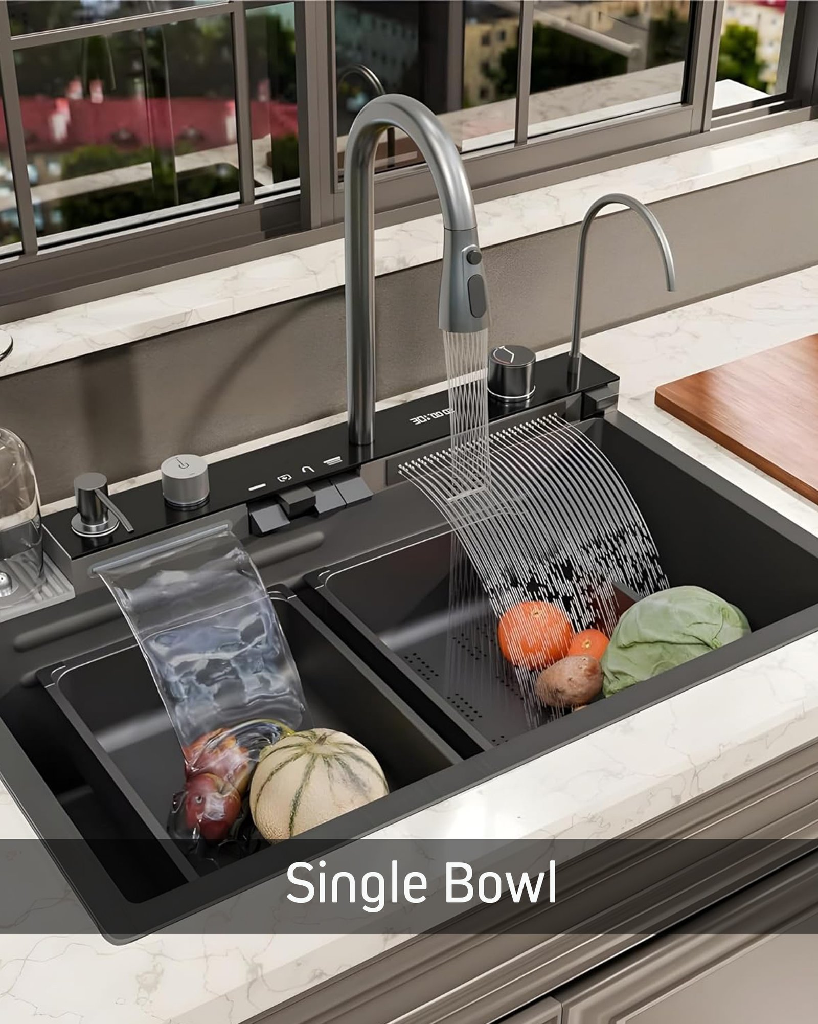 HAPPY HOMES 304 Grade 24X18X10 Waterfall Satin Kitchen Sink With Integrated Waterfall And Pull Down Faucet-Fruit Basket With Complete Accessories,Black