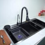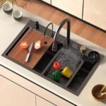 The anti-scratch honeycomb surface minimizes visible scratches and maintains a clean, elegant look even with daily use. Featuring an integrated waterfall outlet, a pull-down faucet, and a dedicated water purifier tap, this sink delivers seamless water control and functionality. The package is completed with essential accessories including a dustbin holder and metal fruit basket, making it a complete modular kitchen solution. Finished in a bold black coating, this sink adds a striking, premium touch to contemporary kitchens.